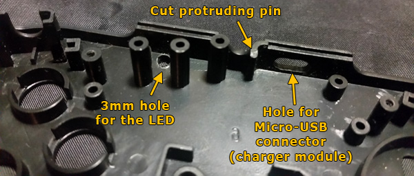 Do the three mods to the top shell according to the picture below (hole for LED and micro-USB, cut protruding pin).