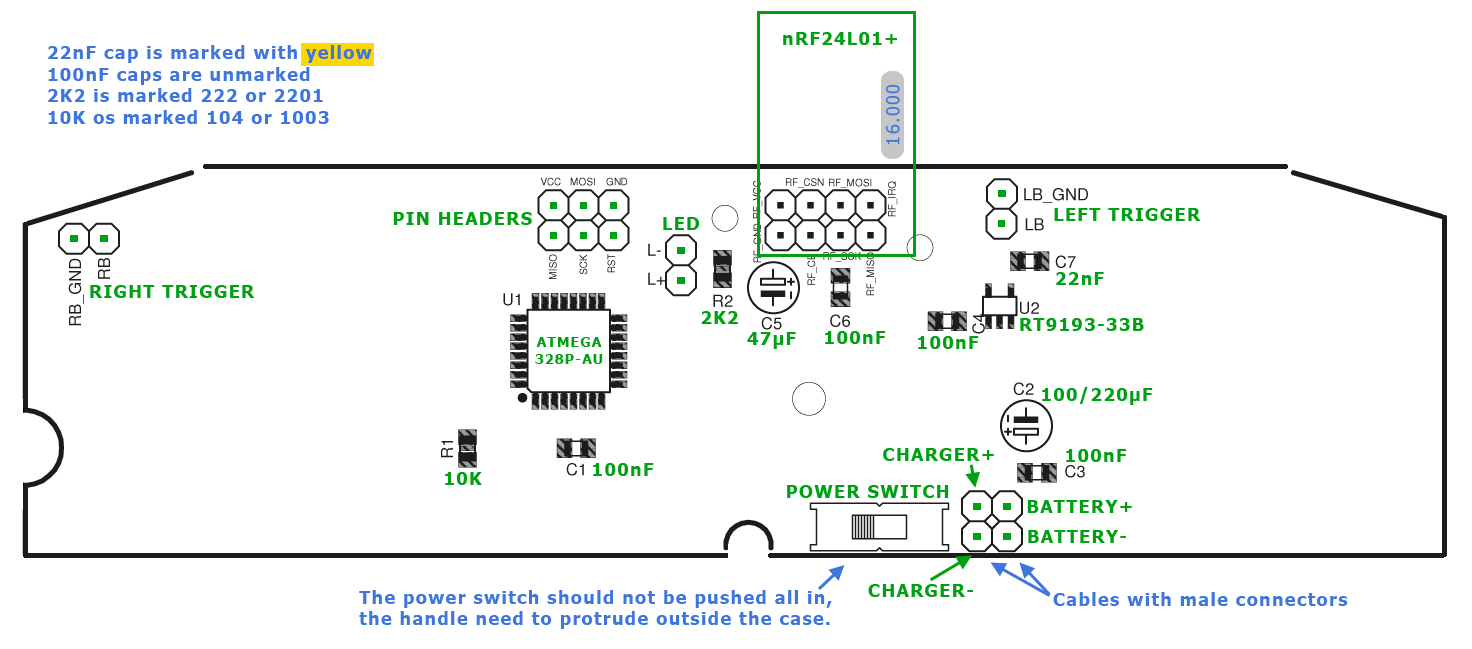 Solder the the PCB components according to the following layout (Click the picture to view a larger version). SMD capacitors are either marked with codes or colours as in the layout image.